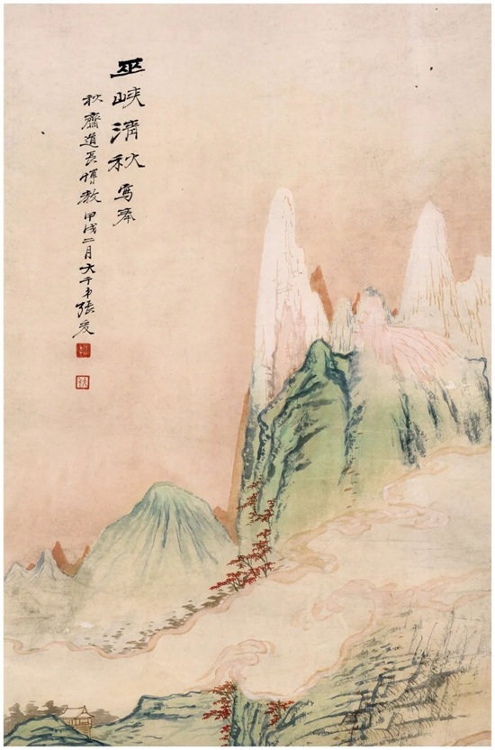 赠王秋湄《巫峡清秋图》中,设色淡雅,清意醉人心。危岩峭壁处云山飘渺,远山间的枫林却描写得繁密细腻。