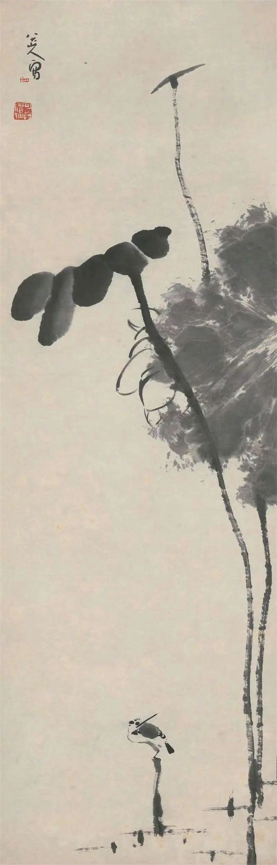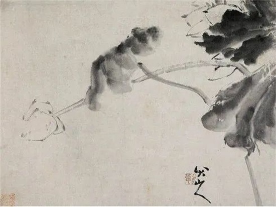 山人荷画中的物象,往往占据画面边角位置、或对角空间,其间以修长的荷柄承接,此外别无一物,大片虚白,干净之极。这些空白给人以亦天亦水亦雾岚的朦胧感,也给人以闲适的宁静感,似乎时间已然凝固,荷塘中另有一个不受世事惊扰的彼岸世界。