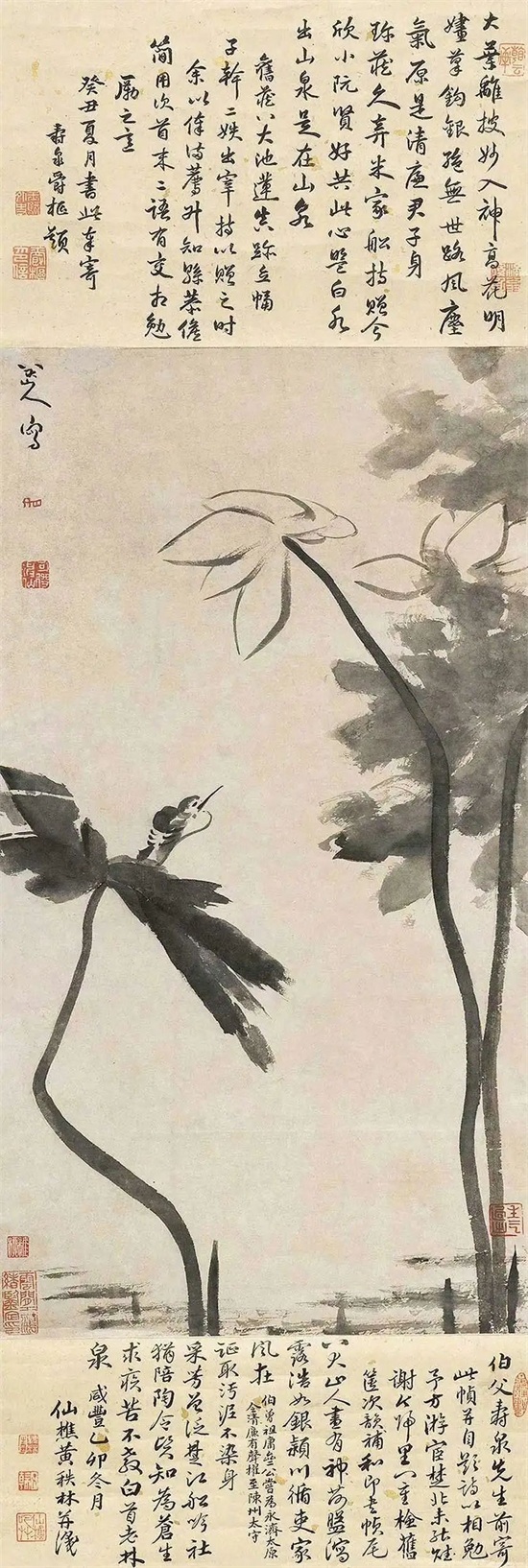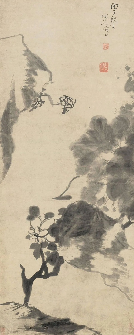 荷花是八大山人最得意的画题,他爱荷、梦荷、吟荷、写荷、画荷,荷花是他艺术生命中的重要组成部分。八大山人的墨荷艺术独步古今,纯以笔墨取胜,罕见用色,其笔墨和形式简练的背后,给人留下了无穷的审美空间。