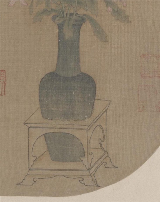图中瓶架上置一蓝釉长颈瓶,内插菊花。花朵施以勾勒填色法,花叶用没骨法出之,刻画自然细腻,渲染柔和润泽。秋菊艳丽而不失于秀雅,此图为南宋写生画中的优秀作品。