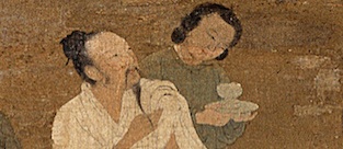 史书上记载宋徽宗的生日party上,下酒菜包括各种肉食和面食,估计这次聚会也少不了肉食和面食。看桌子上有碗,估计装的是“梅花汤饼”……只不过梅花汤饼要有梅花的时候才能做,好像和画里的时节差了些。不过另外一道菜,用橄榄和例子做的“梅花脯”,很可能就有了。