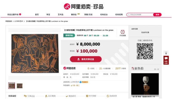继艺术巨匠徐悲鸿5幅原作上线阿里拍卖之后,现代艺术大师巴勃罗·毕加索的3件作品也看中阿里拍卖,将于8月30日线上开拍。这3件作品包括陶瓷《草地上的午餐》、《骑士和马》以及彩色石版画《快乐的小丑》,其中《草地上的午餐》是3件作品中最贵的一件,起拍价800万元。用户在手机淘宝、支付宝里搜索“毕加索拍卖”即可一键直达拍品参与竞拍。