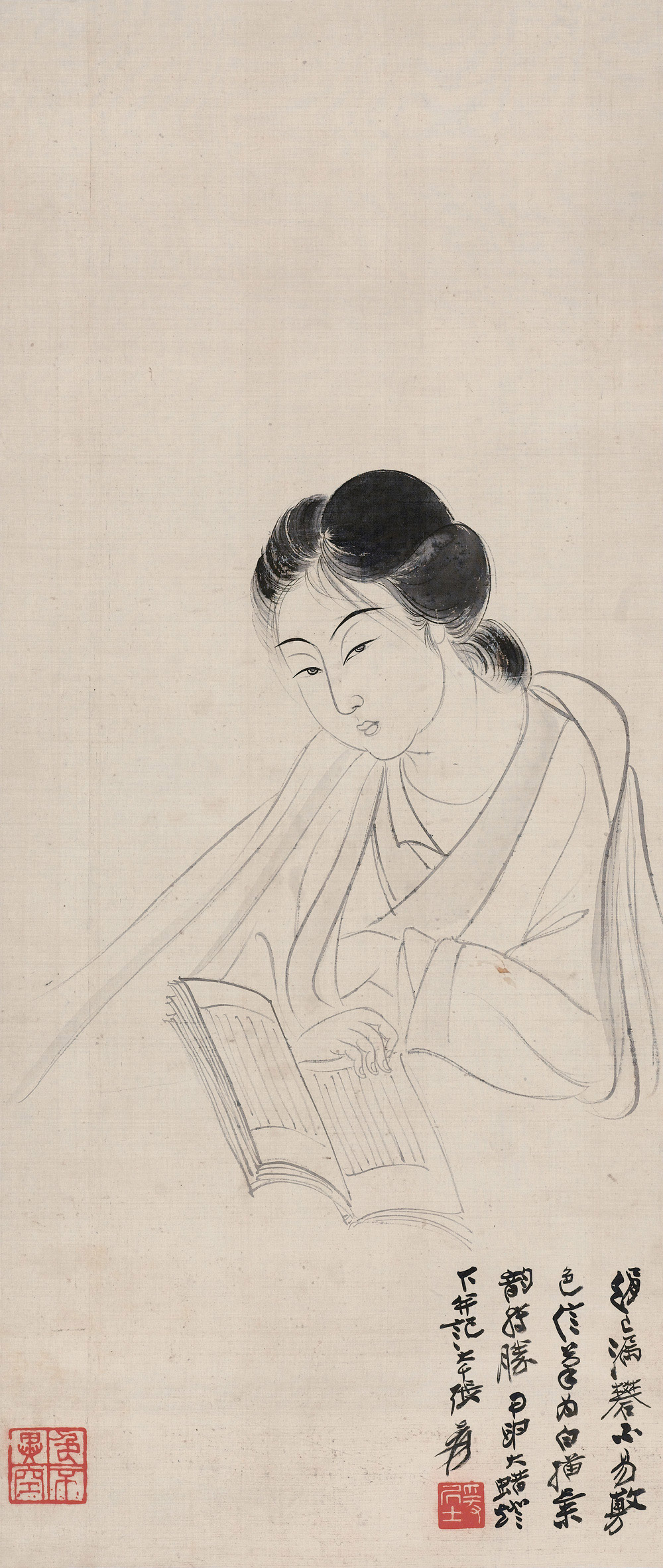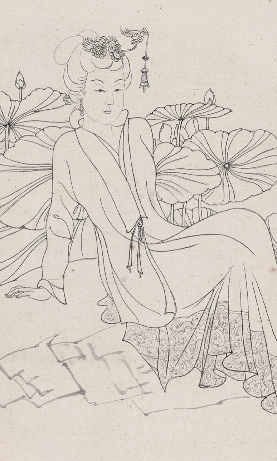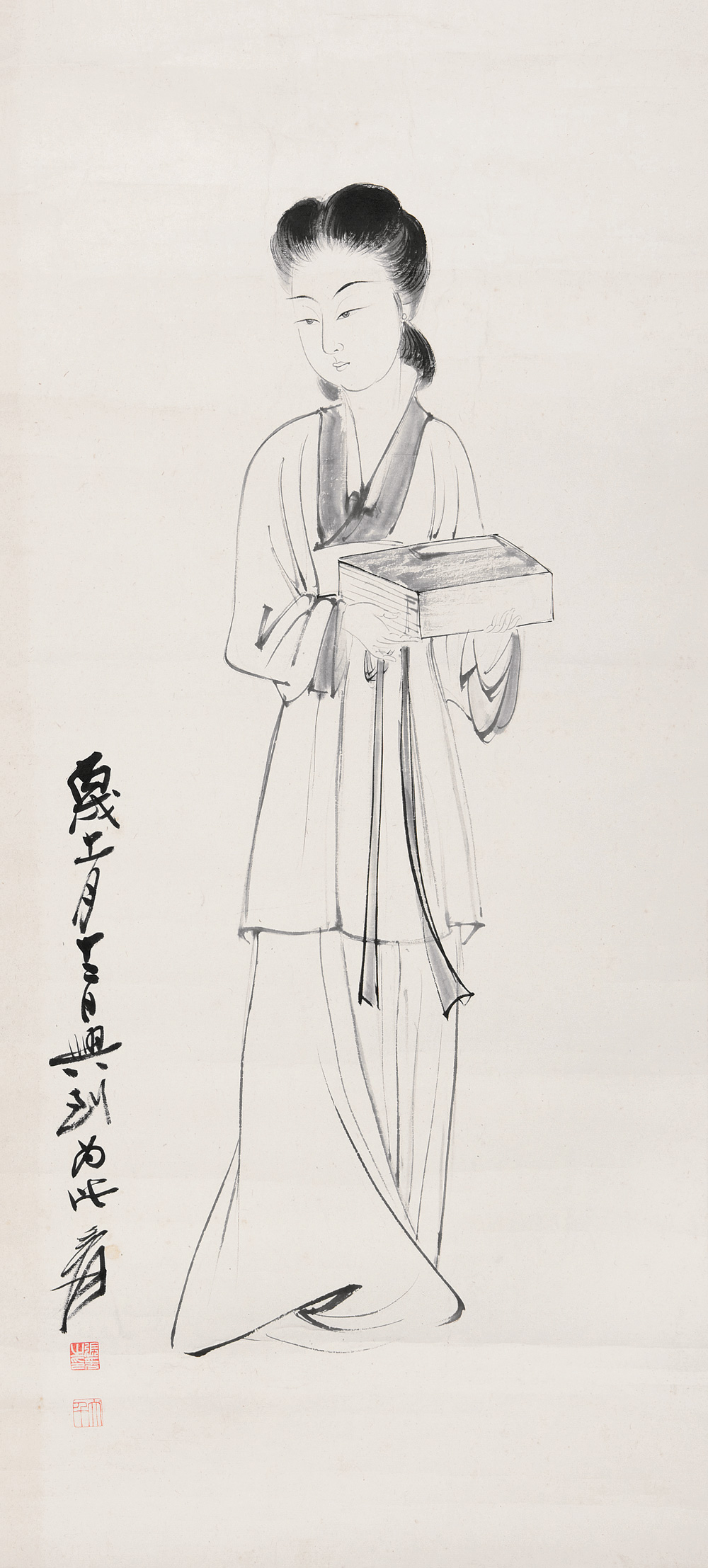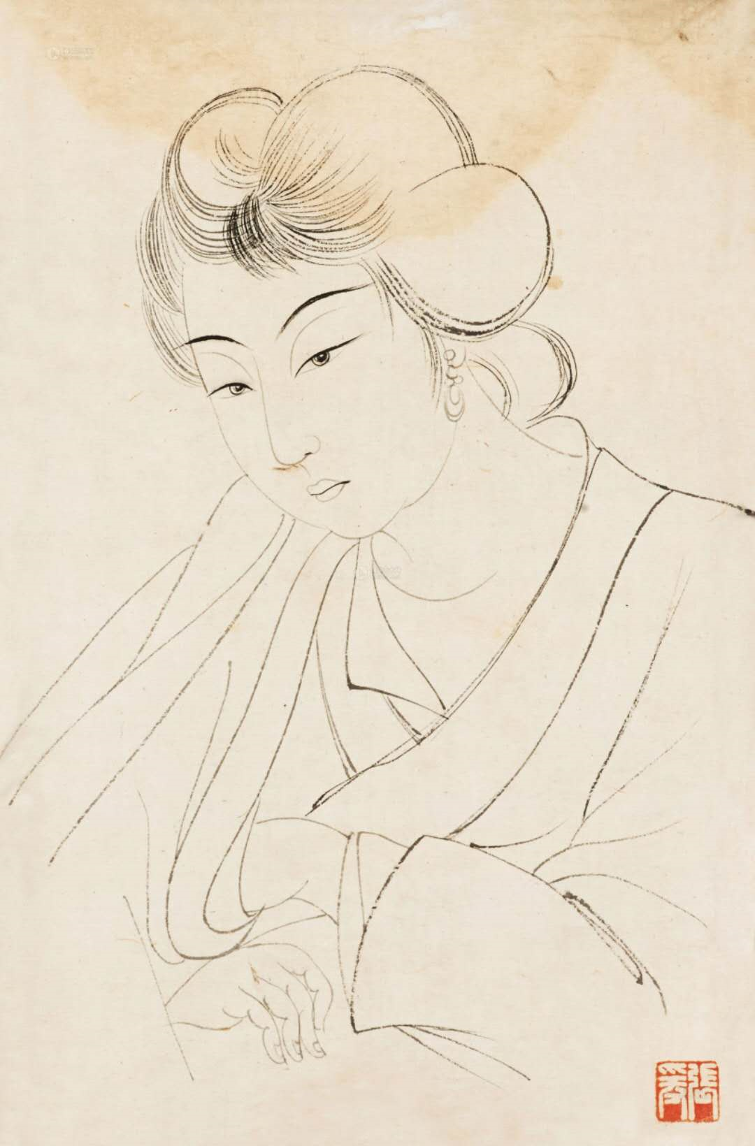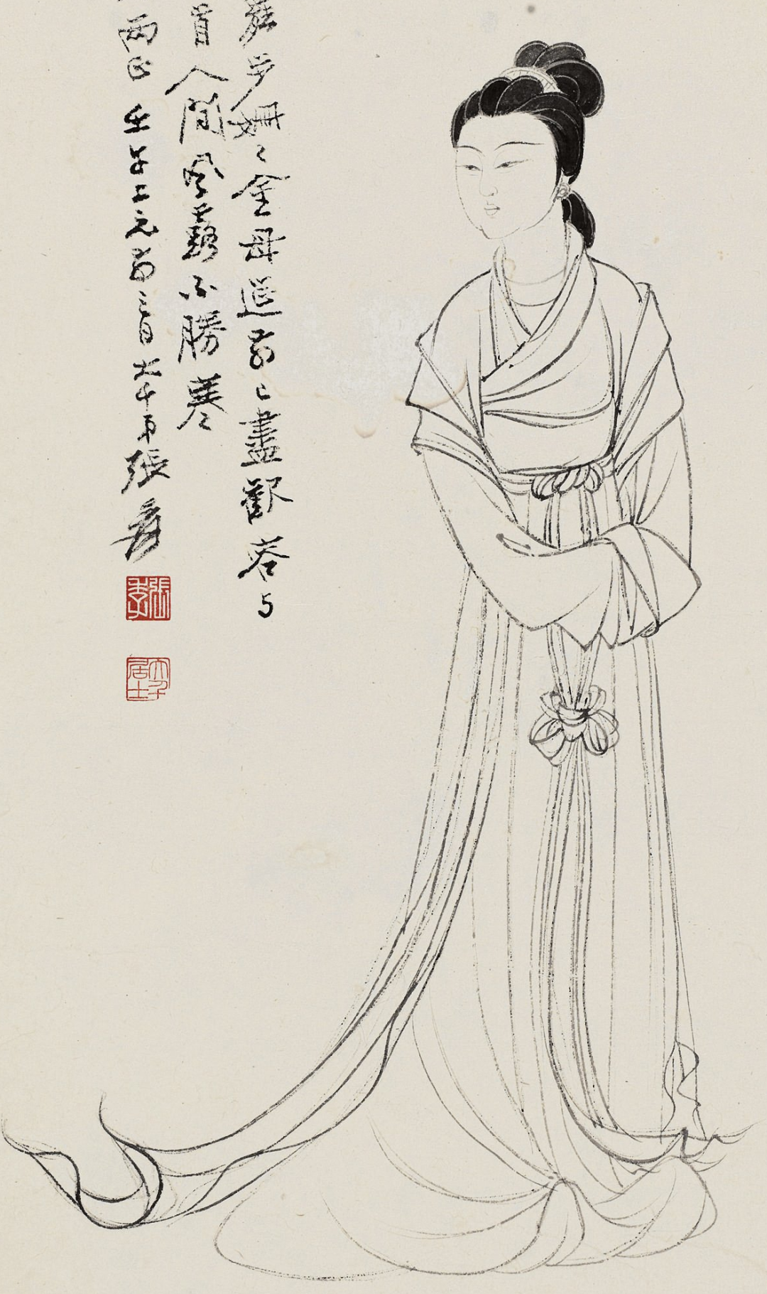 在线条运用上,张大千借鉴了敦煌壁画中线条的流畅与变化。他通过勾勒、敷设等技法,将线条运用得恰到好处,既表现了人物的形态美,又传达了人物的神韵和情感。