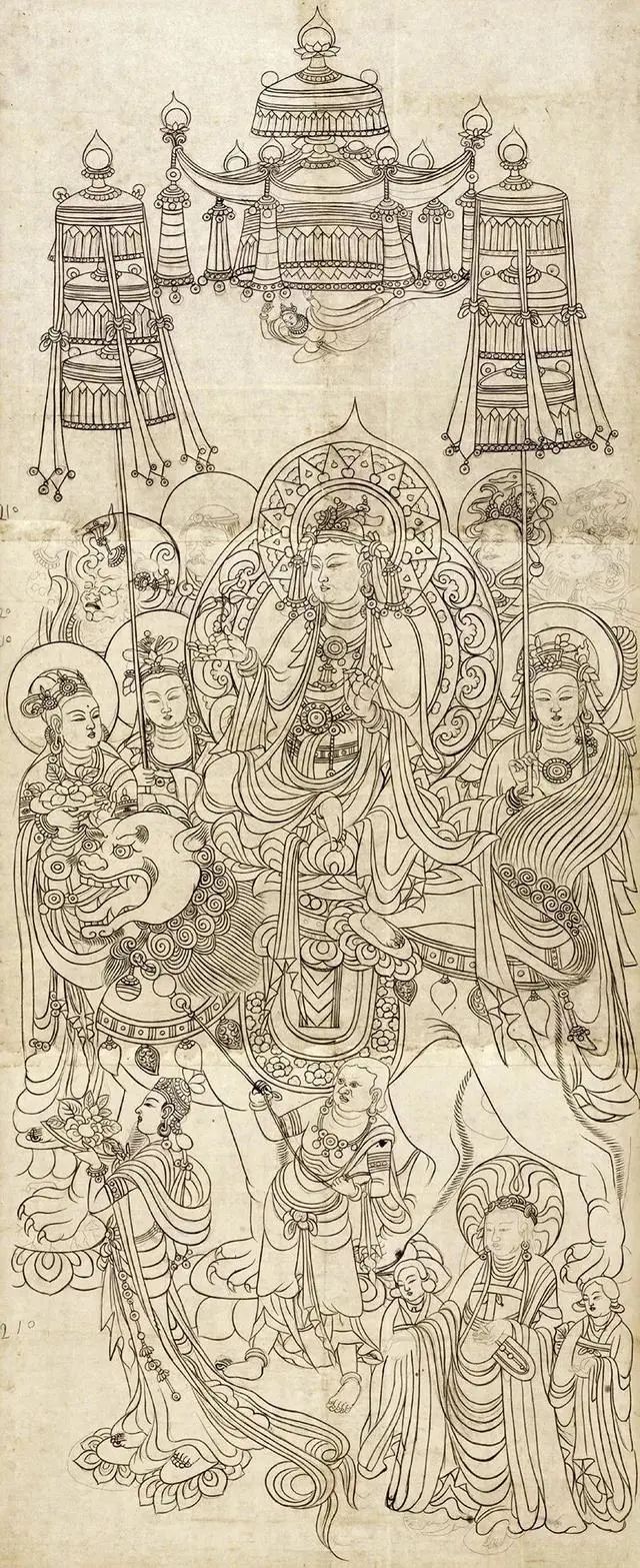 此外,张大千在临摹过程中还采用了透明纸印描、铅笔修正、毛笔定稿等步骤,以确保临本的精准度和与原壁画的相似性。同时,他还对原壁画存在的瑕疵进行改动,带有再创作的思想和意识,使临本更趋于完美。这种再创作的过程,不仅体现了张大千对艺术的执着追求,也展现了他对敦煌壁画艺术的深刻理解和独特见解。