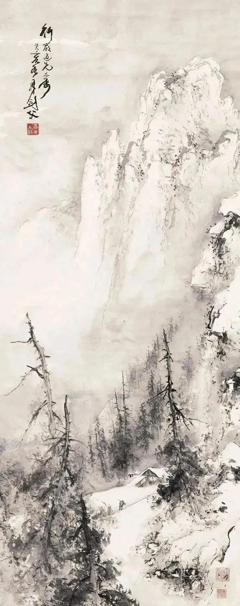 高剑父的山水、气势磅礴,笔法有近似马远、夏圭一体的,横砍竖劈,干笔飞白,于秀逸中见刚劲。所作朝阳夕照、风雨晦暝、烟霞云雾之景,生动再现了南国山川的秀丽多姿。