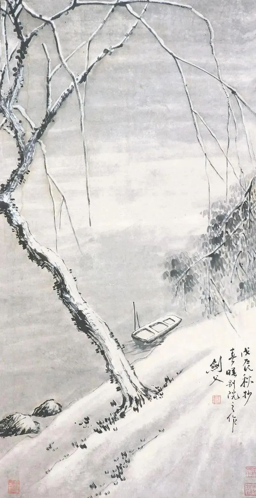 《渔港雨色》为高剑父代表作。采用西画构图方法,讲究空间透视关系,弱化了传统笔墨程式,吸收了日本画新派的渲染技法,从而贴近了雨色气氛的真实感,为折衷派之典型样式。