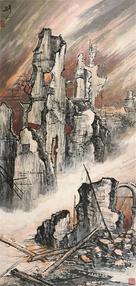 其作品多用水墨渲染,甩笔泼辣,时作没骨法,除树石局部略用线条外,天色、水光和云雾都以水墨渲染,墨卷波涛,笔缩云烟,深浅远近,诗意盎然。