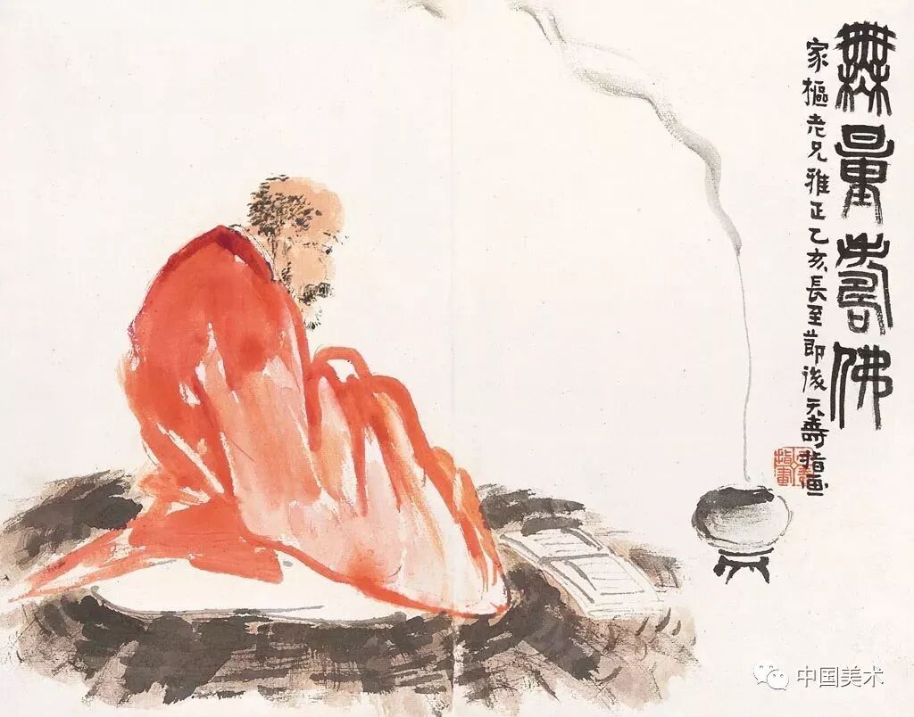 潘天寿的《无量寿佛》还属于他酝酿自我风格的“艺专十年”(1928-1937年)后期,潘氏不多作人物,偶然拟笔,即高古不群。