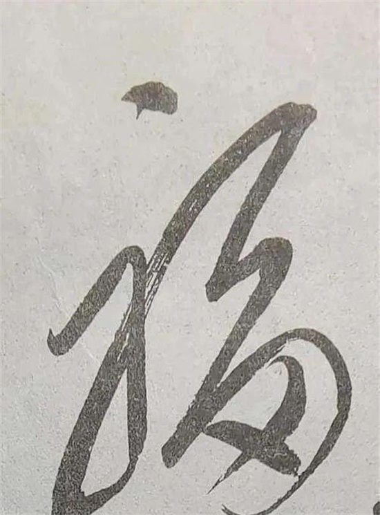毛主席写的第二个“福”字和第一个风格大不一样。最明显的变化在字的开头,也就是第一点的处理上,这一笔横向展开,笔触饱满又洒脱。相比之下,左侧部分的引带更粗重,但这不是笨拙,而是精准控制下的速度与力度的展现,飞白效果很明显,给字增添了动感。