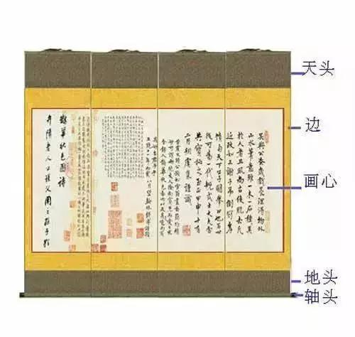 立轴(上图),主要用于竖式构图,悬挂欣赏。画幅的上下左右常常有文人或收藏家题字赞赏。中间部分称“画心”,上有“诗塘”、“天头”,下是地脚。上下又有“隔水”,有的天头贴“惊燕”。