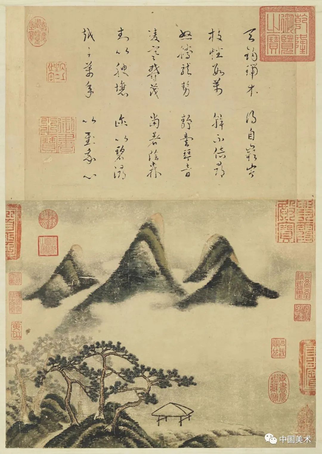 (传)北宋米芾《春山瑞松图》纸本设色 35x44.1厘米,诗塘:27.4x38.7,台北故宫藏
