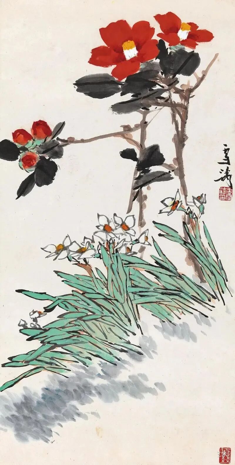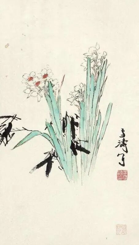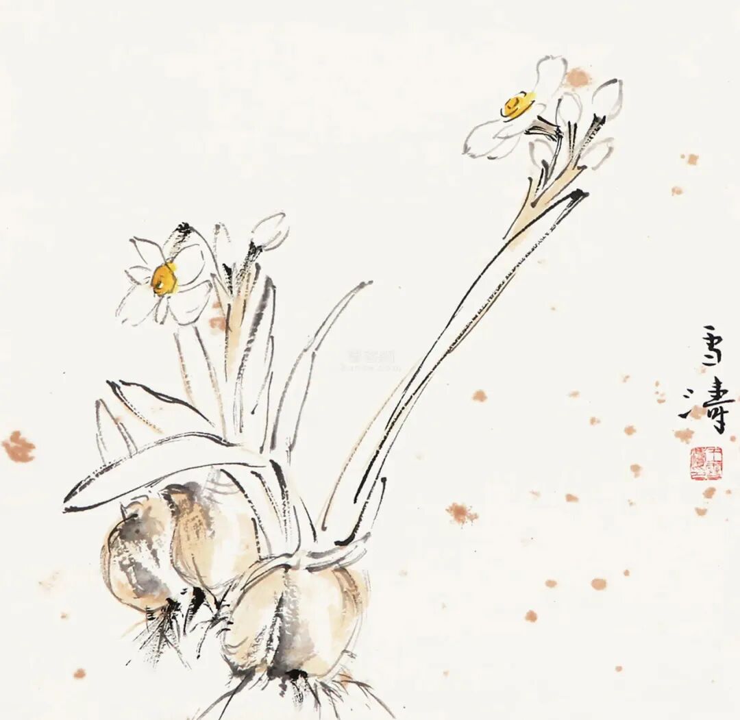 王雪涛的水仙往往以简练的线条勾勒叶片与花瓣,注重虚实结合。叶片多用淡墨挥洒,柔中带刚,既表现水仙的挺拔之姿,又通过微妙的墨色浓淡变化展现叶片的轻盈质感。
