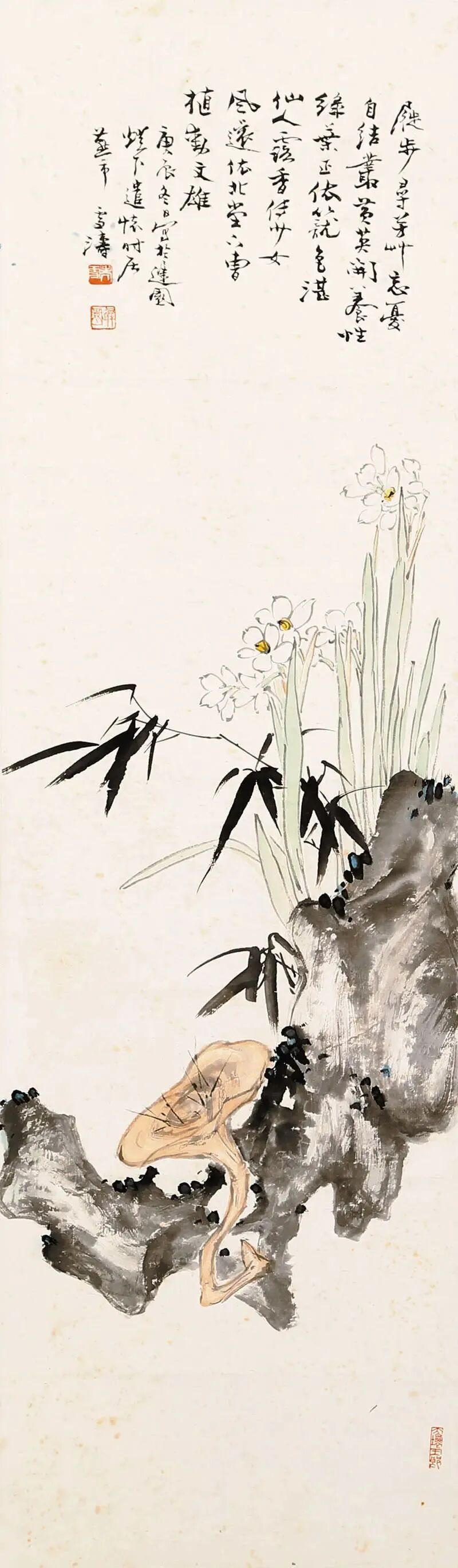 水仙本身象征高洁、清廉,王雪涛在色彩运用上多以水墨为主,辅以淡青、白粉等冷色调,强化其“凌波仙子”的超凡气质。画面常搭配顽石、清水或苔点,营造出清冷幽静的氛围。