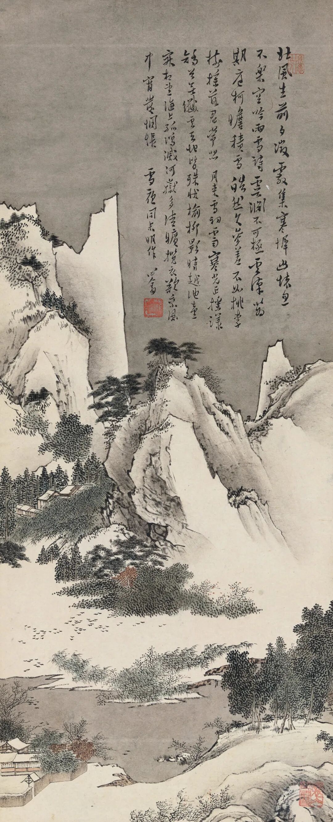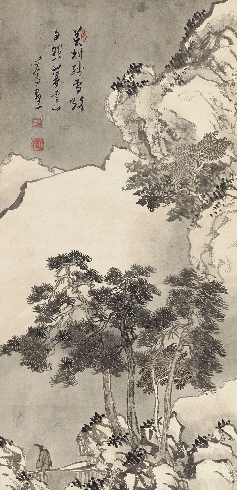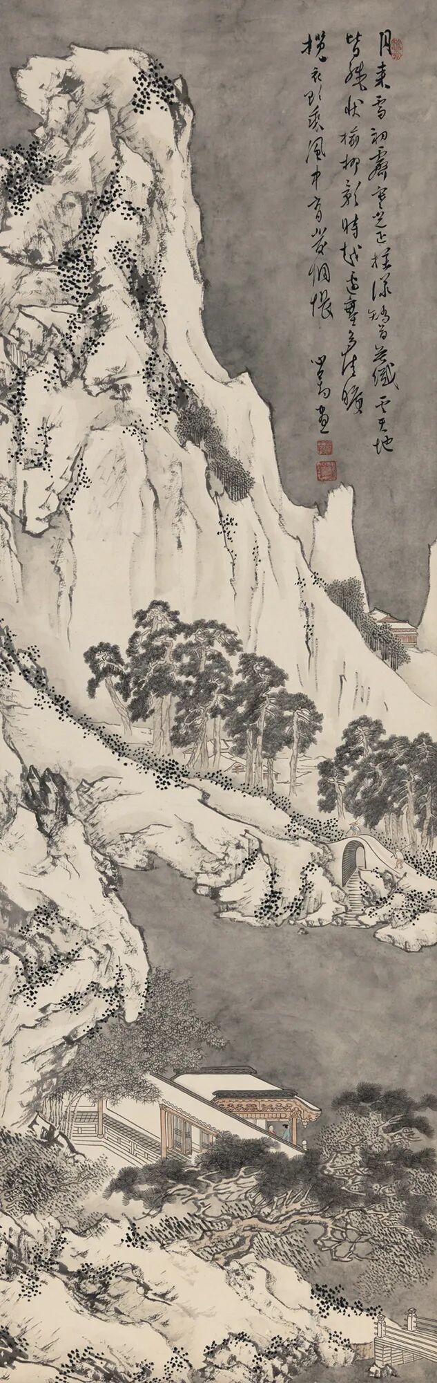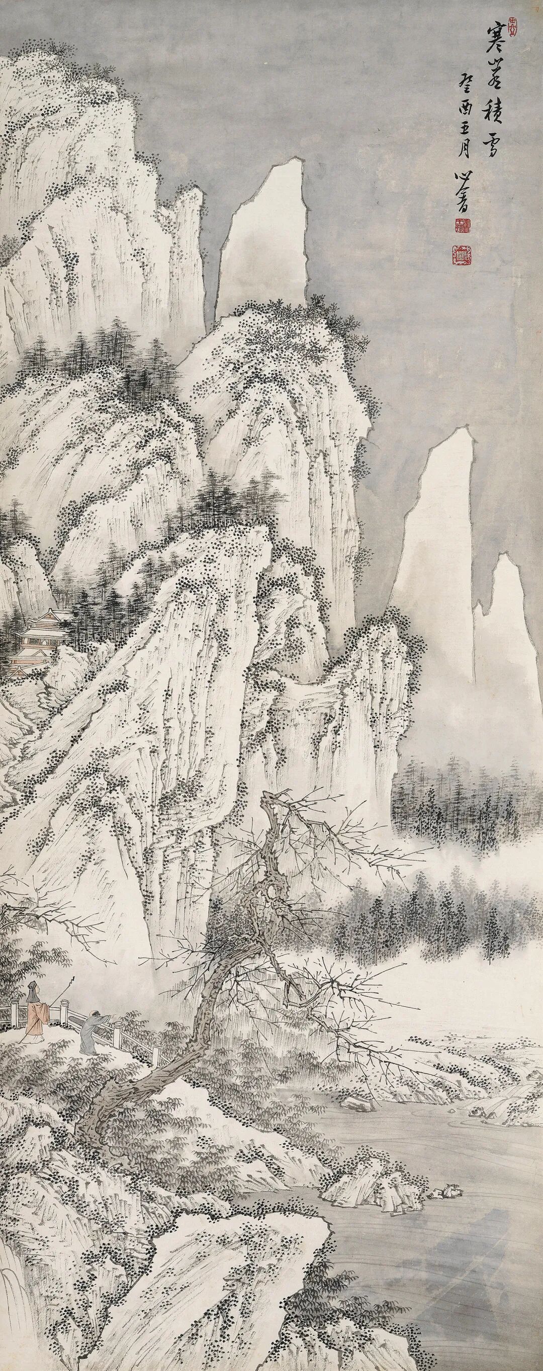 题 识:寒云生涧石,积雪落岩松。营邱大意。心畬。