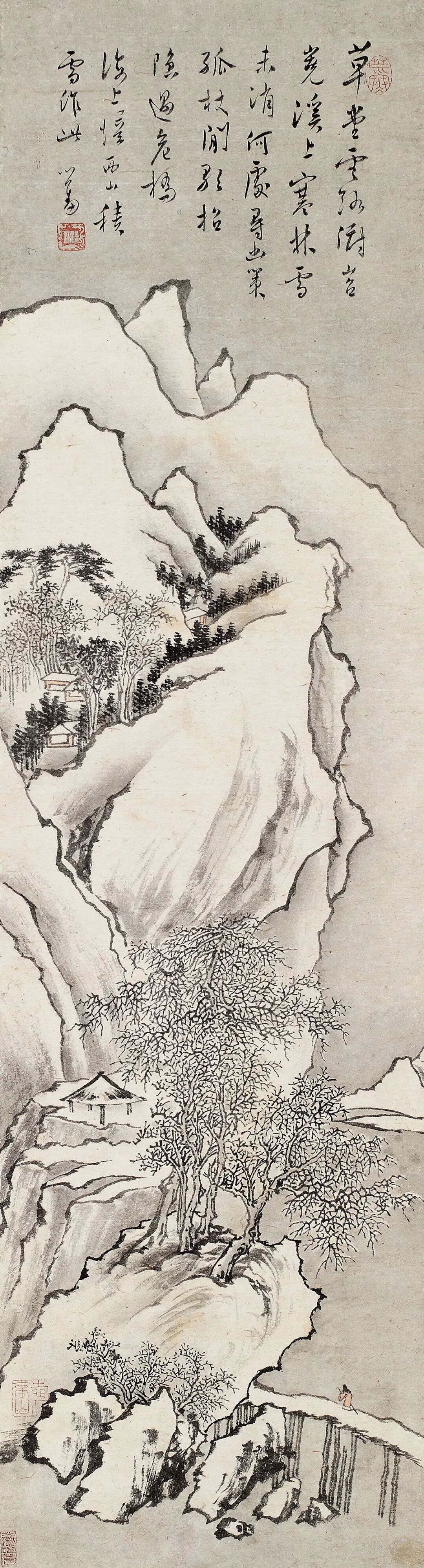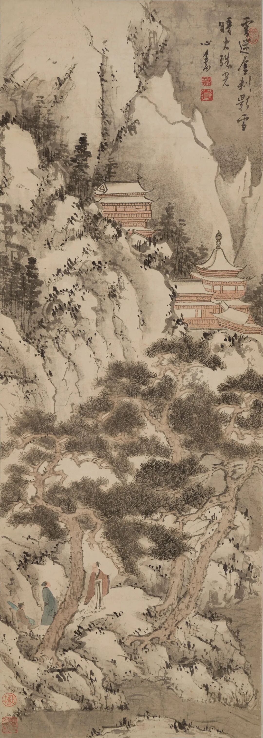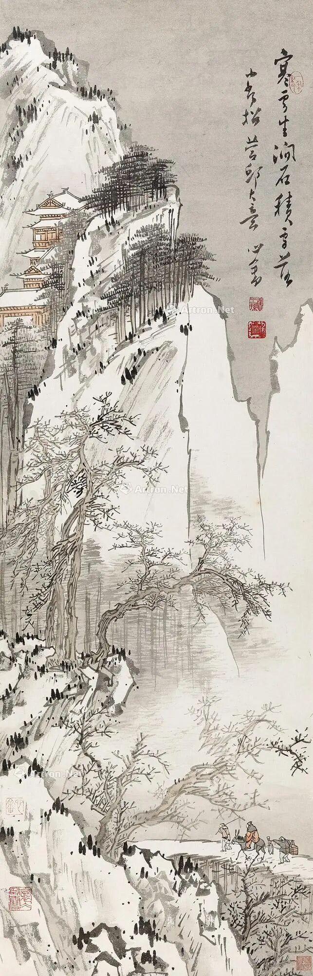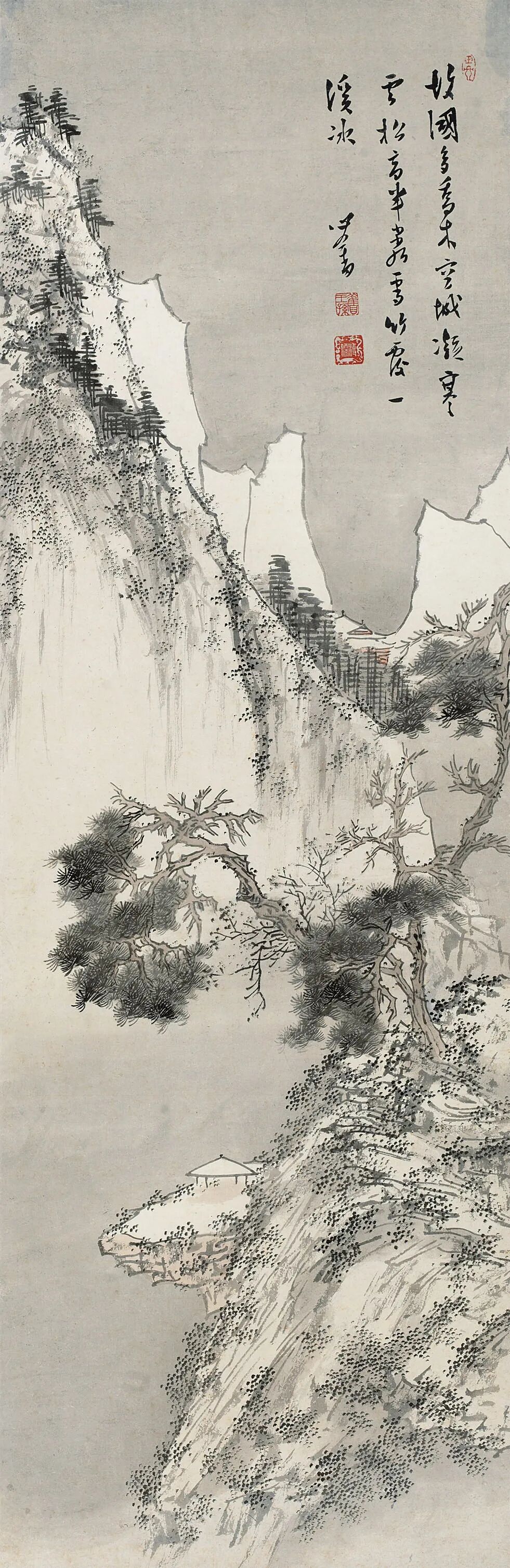 题 识:寒云生涧石,积雪落岩松。营邱大意。心畬。