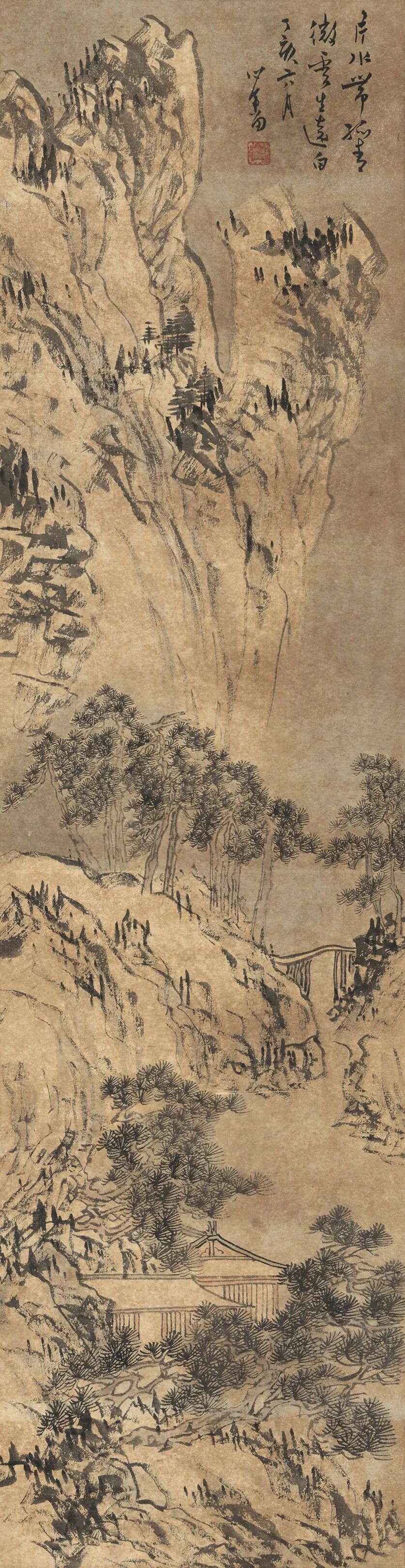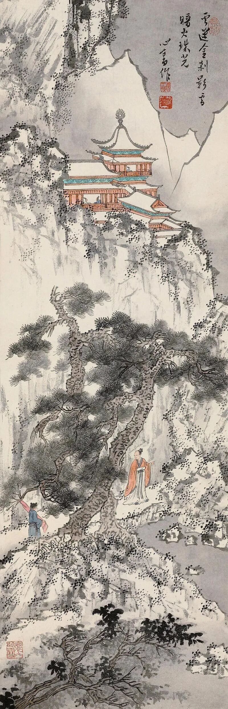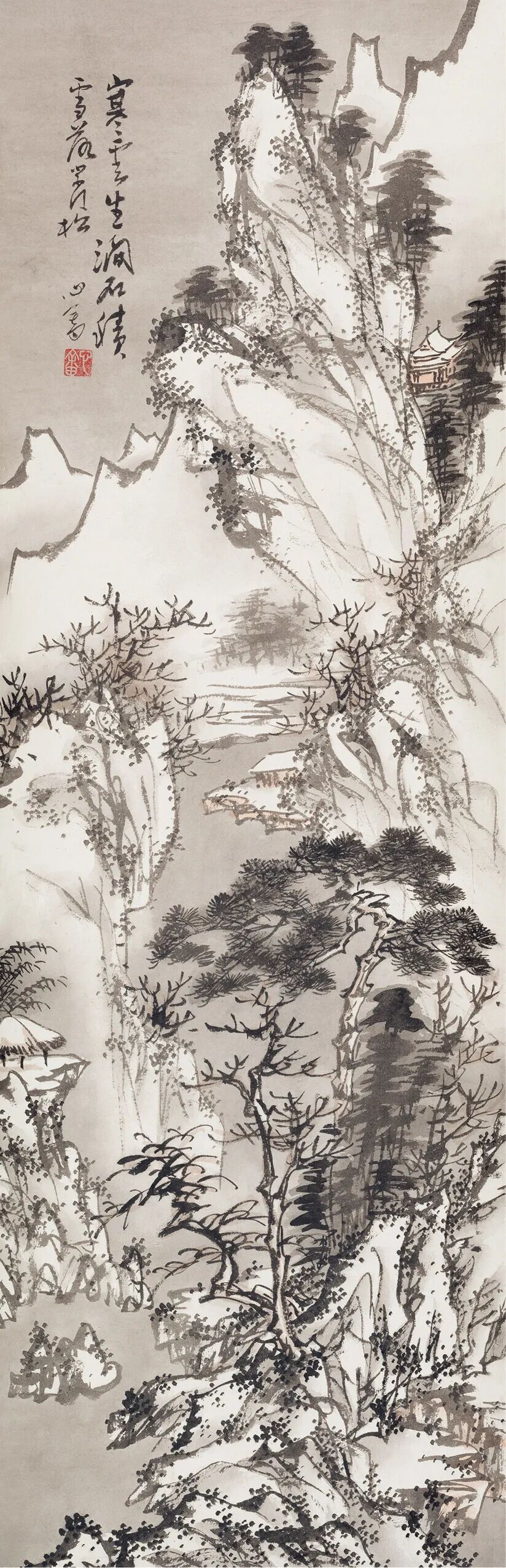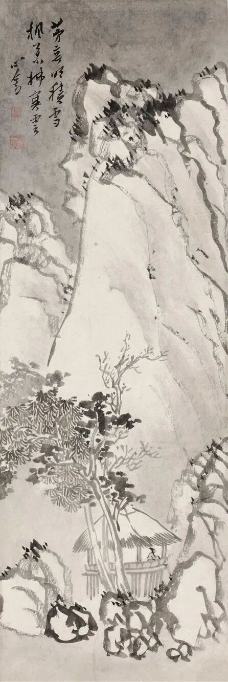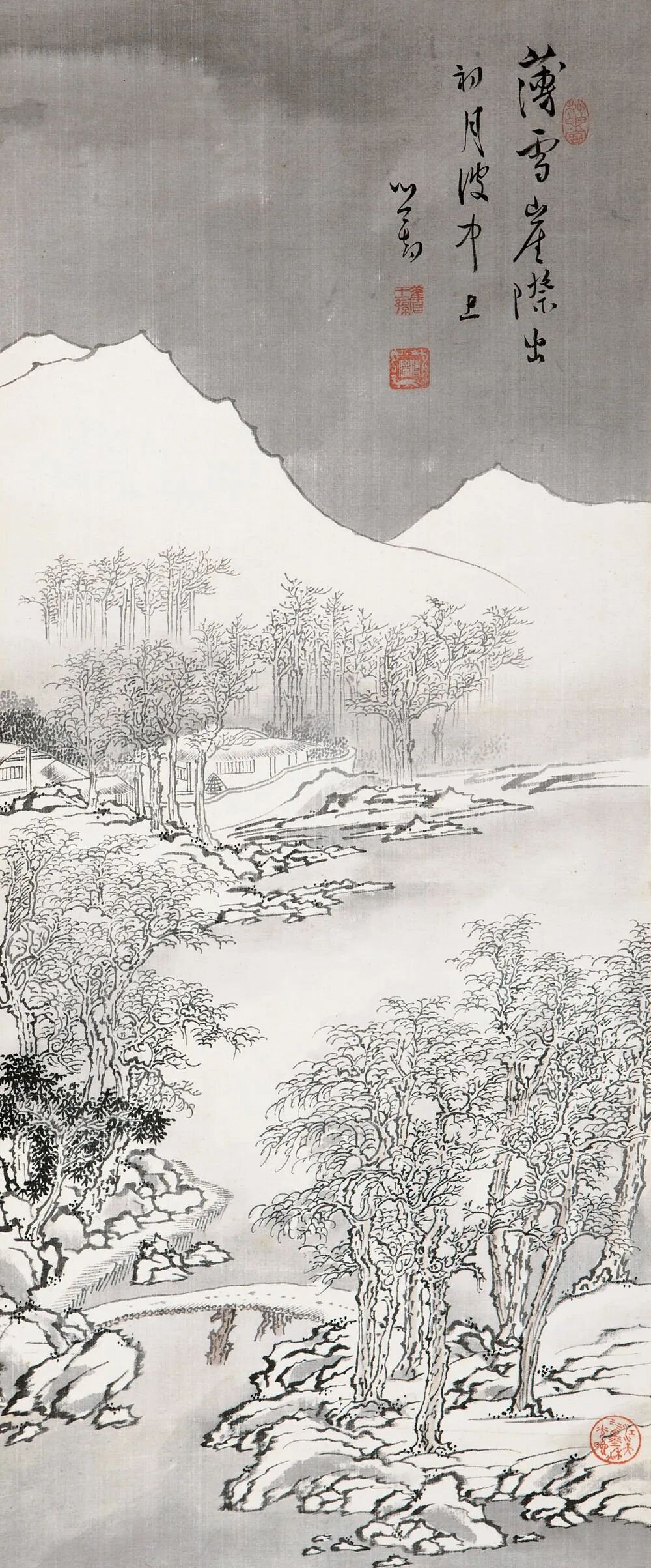 题 识:寒云生涧石,积雪落岩松。营邱大意。心畬。