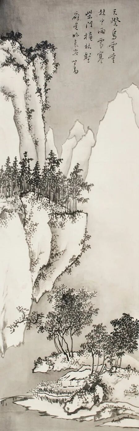题识:今夜岩斋冷,幽尊湛芳洁。习习林下风,萧萧北窗雪。远塞飞鸟没, 冻浦孤舟歇。灌木寂众响,岩云互相越。 缅怀羲皇人,鸣琴慰高洁。心畬画并诗。
