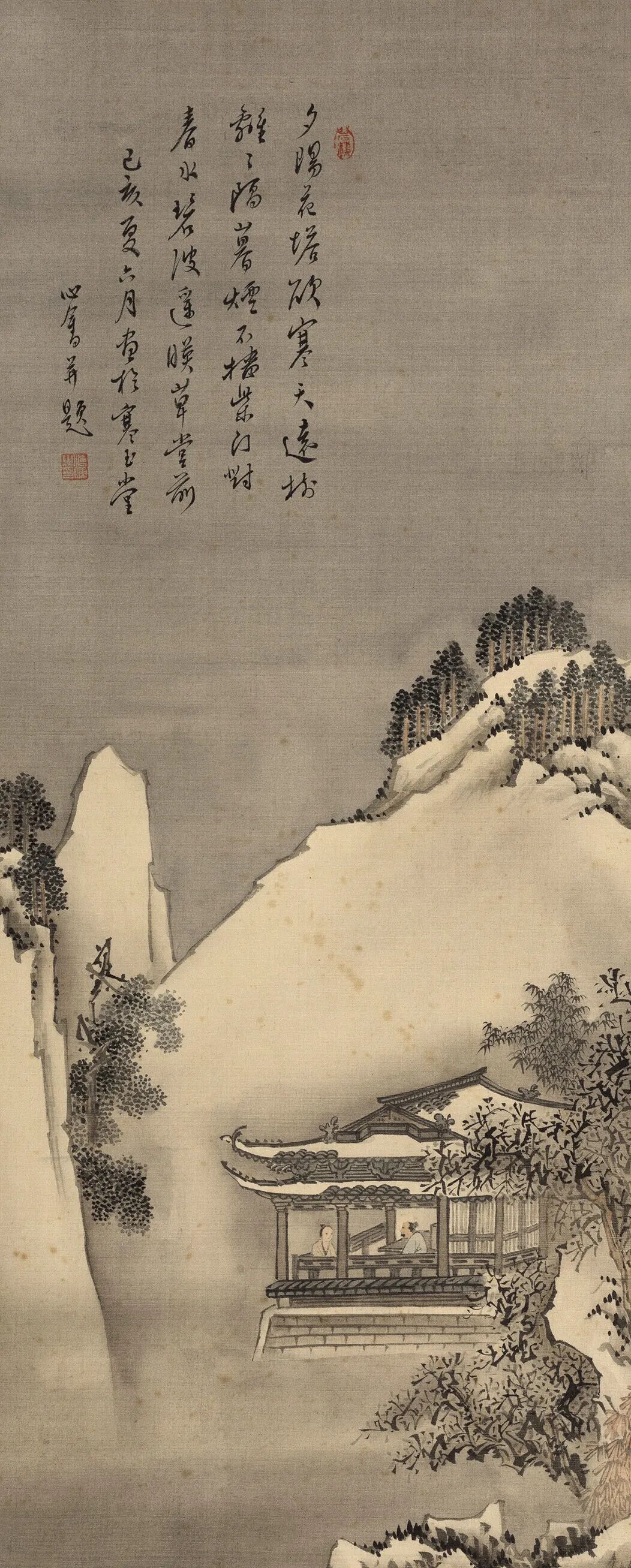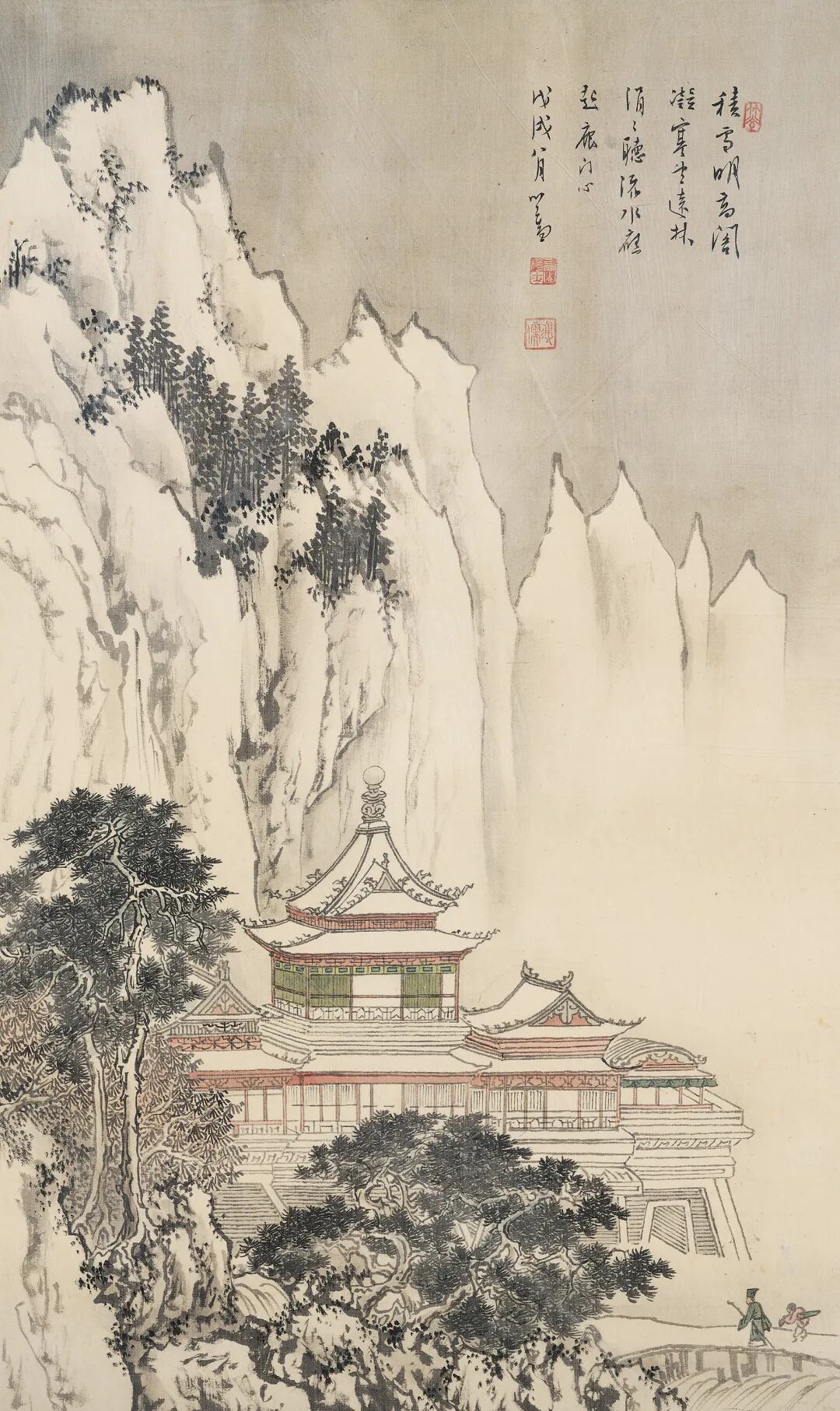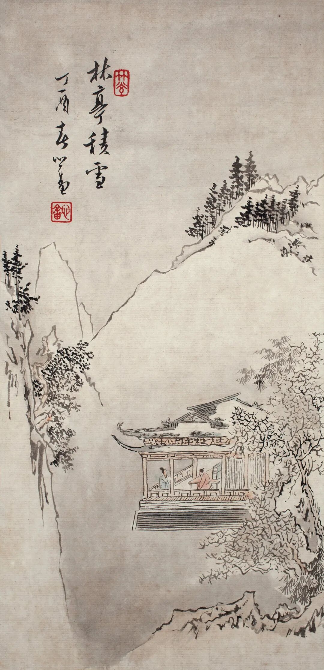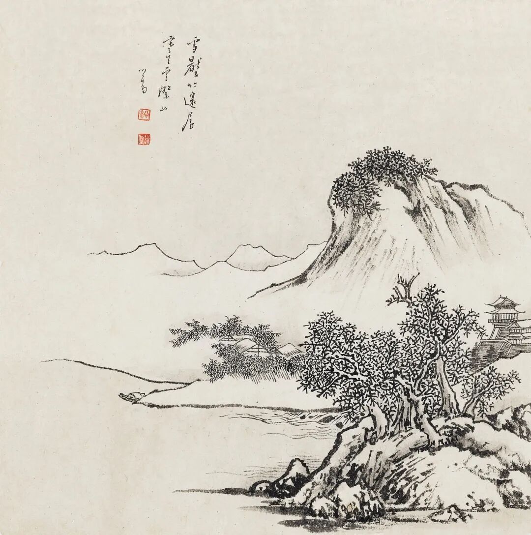 题识:积雪明高阁,凝亭望远林。消消听流水,应起鹿门心。戊午八月心畬。
