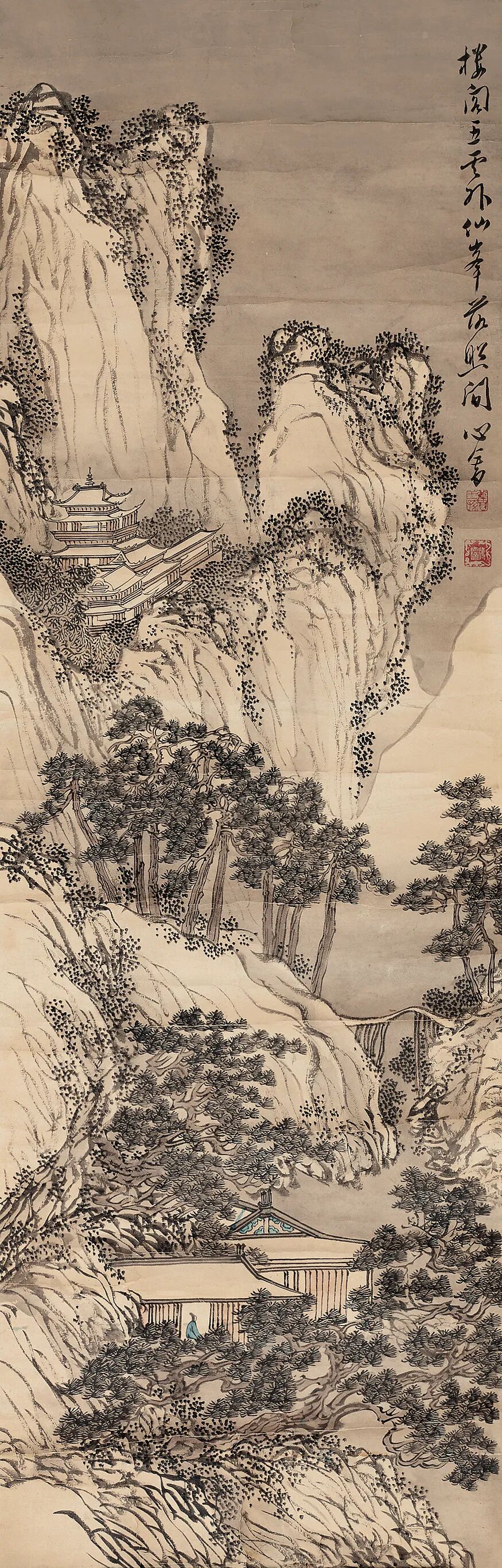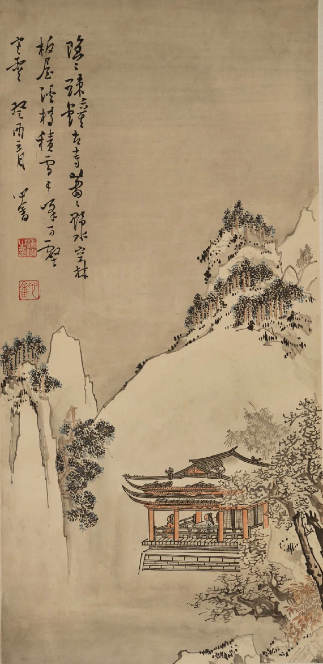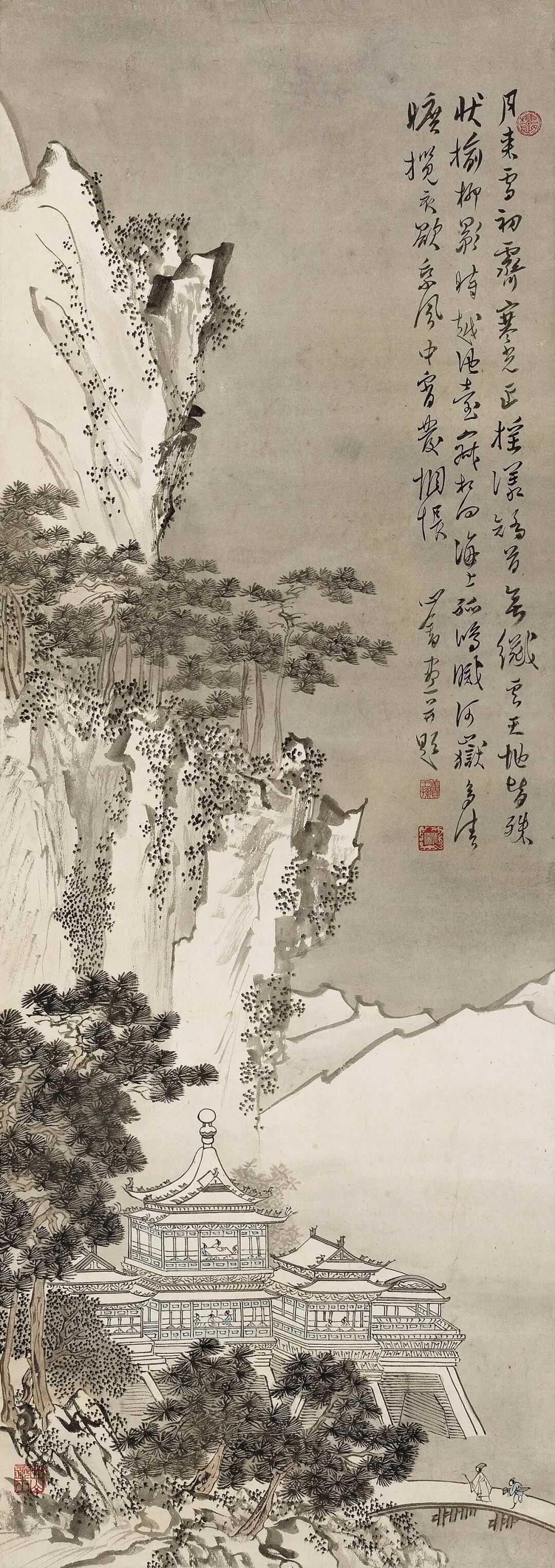 题识:积雪明高阁,凝亭望远林。消消听流水,应起鹿门心。戊午八月心畬。