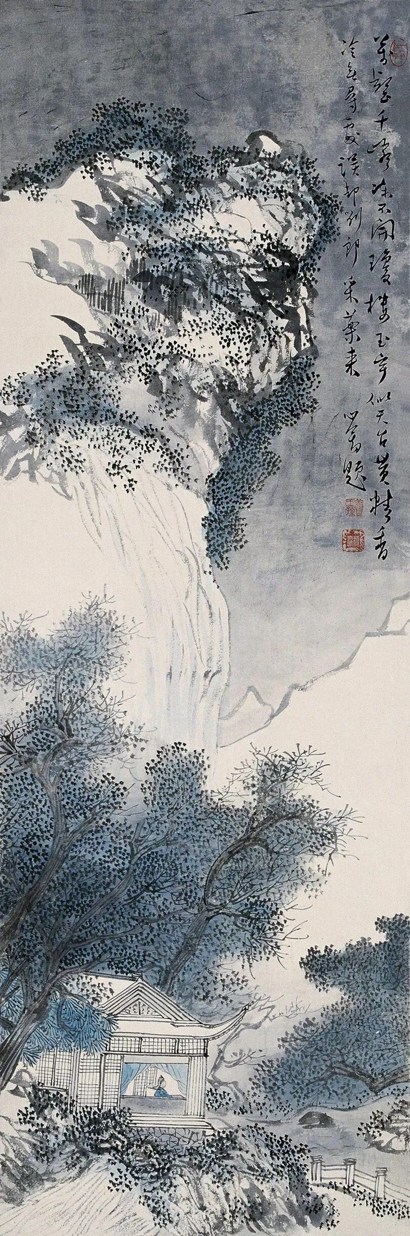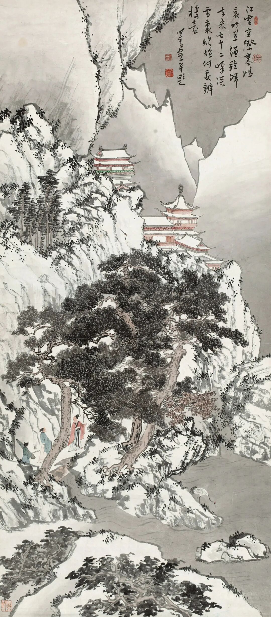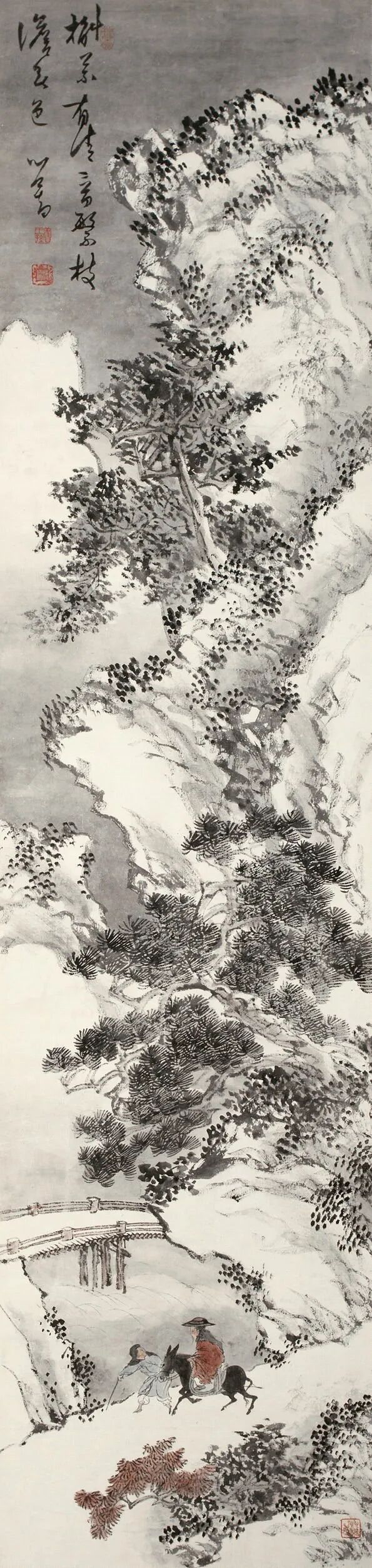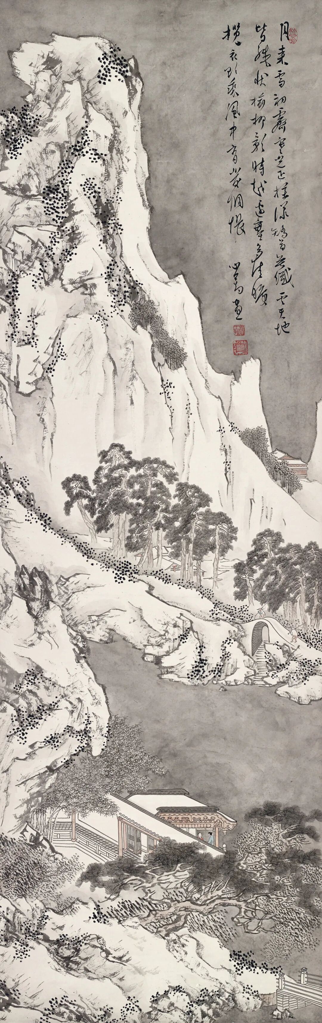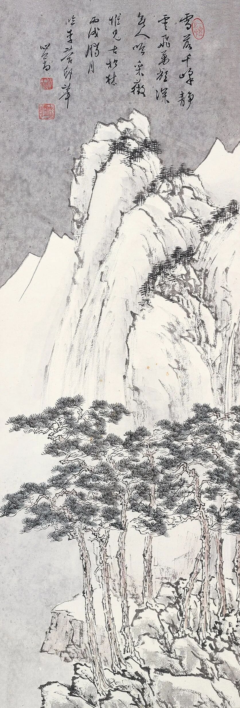 溥儒的雪景山水画独具魅力,他兼取宋元以来南北宗诸家之长,既有北宗山水的风骨与点皴,如以斧劈皴表现山石,使山水筋骨有神;又得南宗山水擦染明秀之风韵,令画面浑厚雅逸。画中的山川、树木、屋舍等在白雪覆盖下,仿佛远离尘嚣,纯净至简。他笔下的雪景画,每一幅都像一首诗,每一笔都带着深深的孤独感。