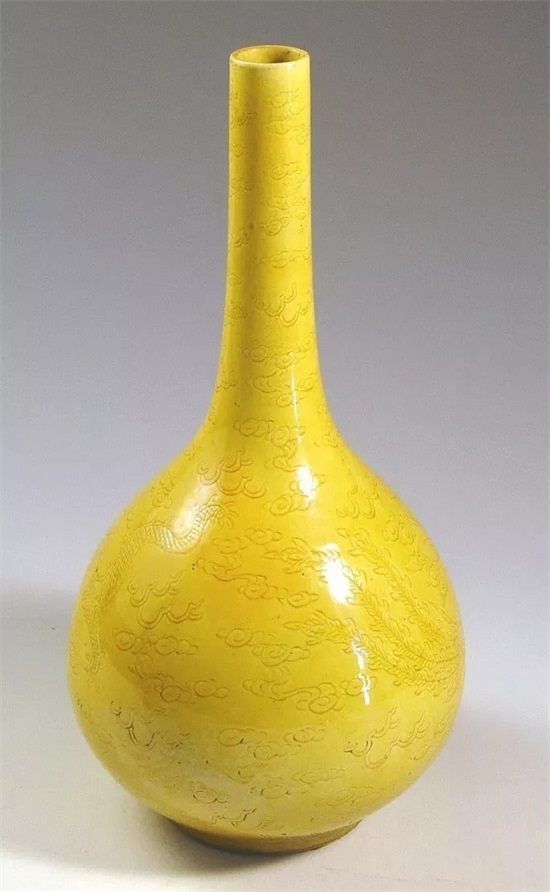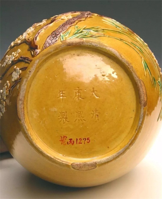 清康熙款黄釉凸雕松竹梅三彩瓶