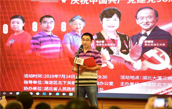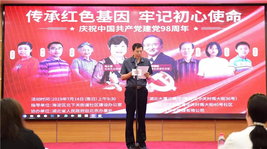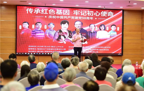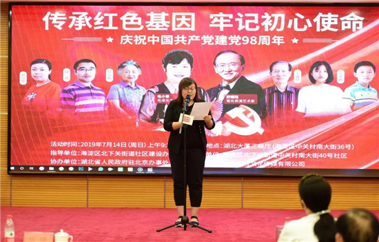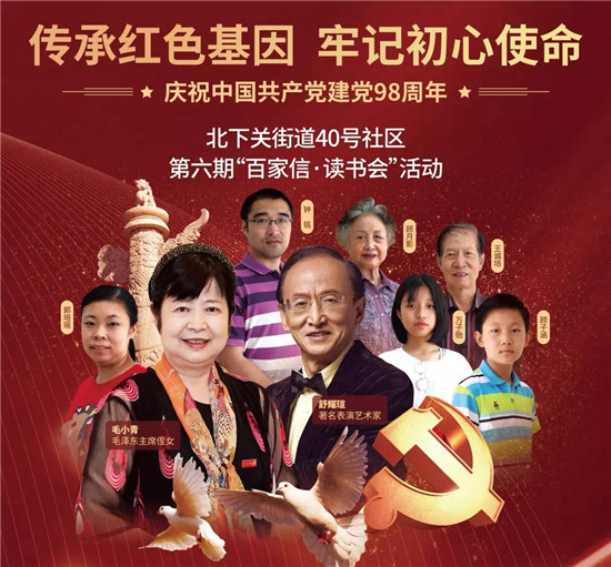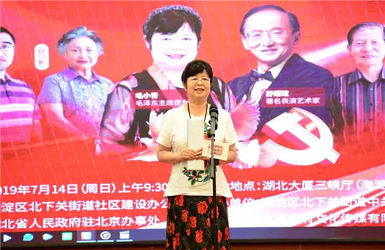 本网讯:2019年7月14日上午,在中国共产党建党98周年,建国70周年之际,毛主席侄女毛小青同志受邀参加:讲好红色故事,传承红色基因,牢记初心使命,北下关街道举行“百家信·读书会”活动。此次活动,为了发掘红色故事的育人价值,激发大家的爱国奋斗精神,让大家与朗读者重新回到那个腥风血雨的年代,共同感受革命先烈们初心不改、信仰坚定、敢于担当的革命品质。此次活动涉及到海淀区党政部分领导、社区老党员、入党积极分子以及团员、少先队员等上百人参加。