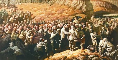 考虑到国博中央大厅的整体空间结构及展览的表现主题,本次展出的13幅馆藏经典美术作品以油画为主,作品描绘的场景绝大部分为气势磅礴的战争场面,展现了中国人民奋勇向前的不屈斗志。而与这些经典美术作品交相辉映的是,展览特地以情景还原的方式展出了一组反映1949年开国大典盛况的馆藏珍贵文物,生动见证了新中国成立这一伟大历史时刻。
