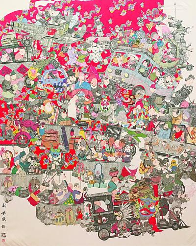 阿塞拜疆画家娜伊拉·阿玛多娃的《伟大的丝绸之路》反映了古代东方的繁荣景象,古老的丝路如行走在戈壁大漠上的驼队迸发出顽强的生命力。希腊画家弗洛朗蒂亚·奥依科诺米杜的《编织未来之路》结合传统和现代技法,选取整合东西方服饰、建筑甚至是“天上飞的、水里游的”各种元素,着重体现“人类到哪里去”这个关乎共同发展之路的大命题。
