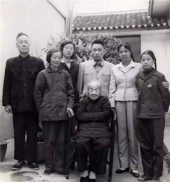 1962年,毛岸青在父亲毛泽东的嘱托下回湖南老家看望90高龄的外婆。左起舅舅杨开智、舅妈李崇德、刘思齐、毛岸青、邵华、表妹杨英