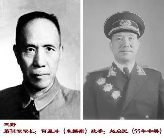 1949年2月16日,根据中央军委全军统一组织和番号的决定,国民党起义部队第77军和华东军区江淮军区第34旅、独立旅合编为中国人民解放军第34军。何基沣出任军长,赵启民任政委。下辖第100师、第101师、第102师,隶属第三野战军第八兵团建制。1949年7月,第100师调归第33军建制。11月,第101师调归第10兵团。12月,第102师师部调归第三野战军特种兵纵队,后改为炮兵第3师师部。1950年1月,第3野战军教导师6个团调归第34军兼南京军区警备司令部建制。同时,军机关一部组建华东军区航空处。11月,军机关及其余部队改编为华东公安第13师。第34军番号遂撤销。