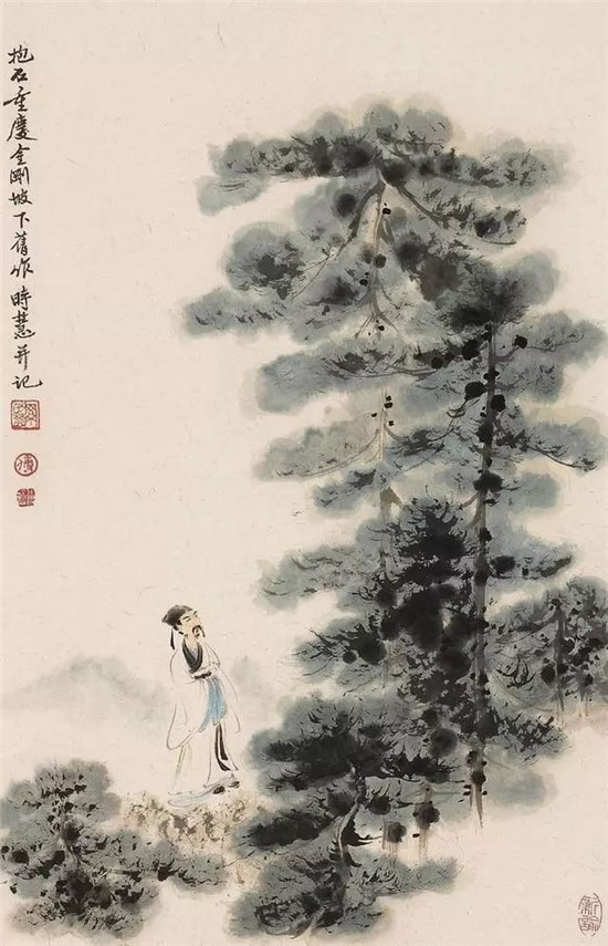 傅抱石最早学画是以临摹传统绘画开始的,十几岁时就学习石涛的作品,并觉石涛的画纵逸恣肆、生动感人,十分钦佩,遂改名为抱石。他一生受石涛影响极深,但学而能化,所临摹石涛及古人名作,形神兼备,具有较深厚的传统基本功。曾见他临摹石涛《游华阳山图》作品,既有石涛之神韵,又有自己的“抱石皴”风格,比起张大千临石涛画多没自己语言自是高明了许多。他通过临摹经典并从历代山水大家中吸取笔墨精华,从而创造出山水画的新意境来。傅抱石先生虽自称:“为山水上的需要,也偶然画画人物”。但现其人物画的传统功力及高古之意来讲,至今也是已无人能超越的。他在画人物画时,明显学古法铁线描、兰叶描以及高古游丝描等之类不同,他化工整细致为写意飞动的线条,并运用破锋飞白手法,看似潦草荒率,但与人物的神韵及内容相符合。这些飞动的线条与他山水画中的皴法风格相近,画面统一和谐,线条飘逸古朴,豪放而隽秀,冷峻而典雅,成就与山水相伯仲间。傅抱石的人物画虽好,但比起山水来就有不少遗憾,比如人物造型单调雷同,特别是有几幅仕女人物画中,其中脸型的方向、位置的大小、表情的动作几乎一样。