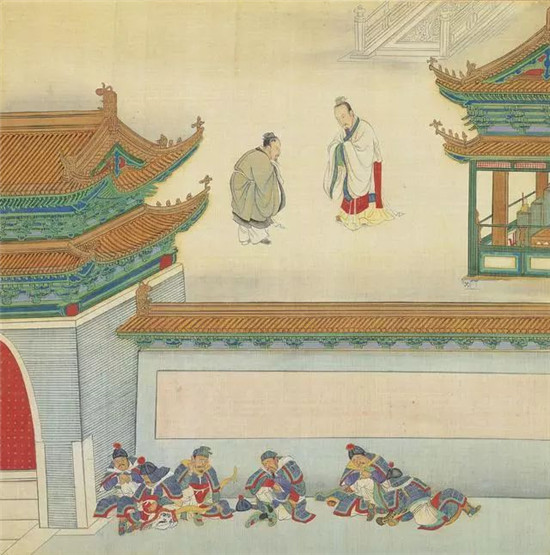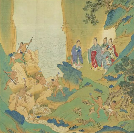 本网讯:《帝王道统万年图》本册共二十幅,分别描绘伏羲至宋仁宗等名主的事蹟,对幅并有顾可学(?-一五六〇)题记。应是仇英应顾氏请托而绘,用以进献朝廷,求得仕进。全册均落笔纯熟、快捷,色调以青绿重彩为主,间或掺用泥金鈎边,画面洋溢着鲜艳而华丽的雰围。