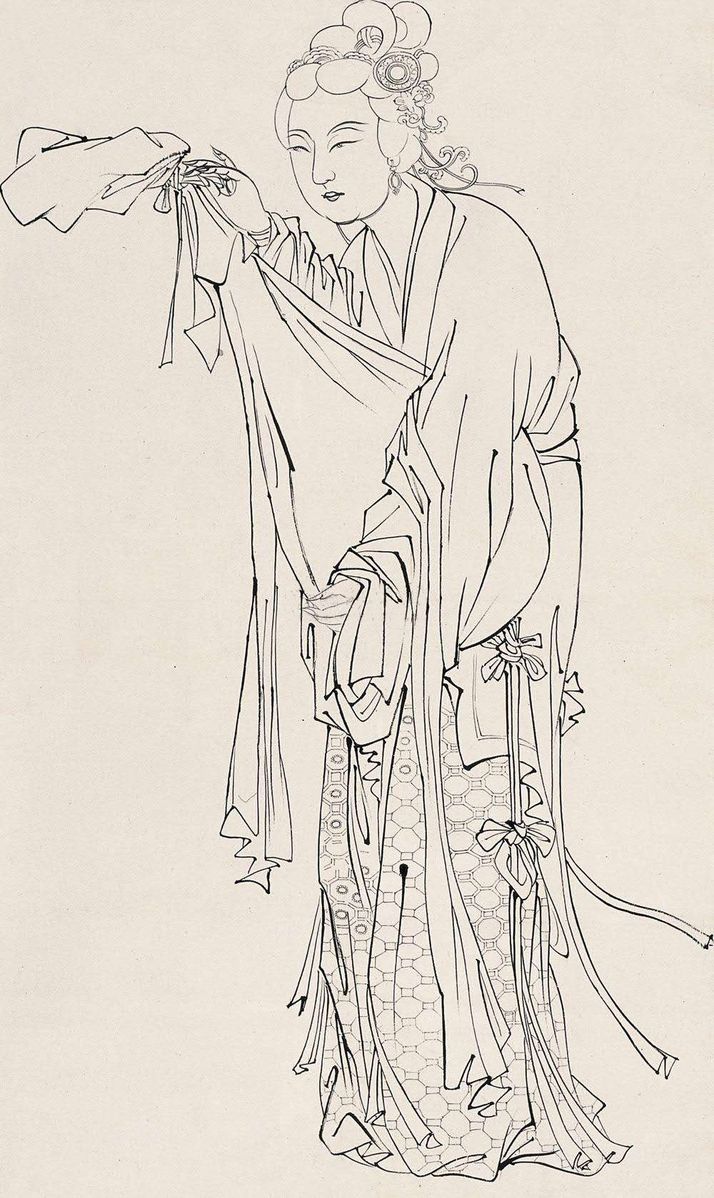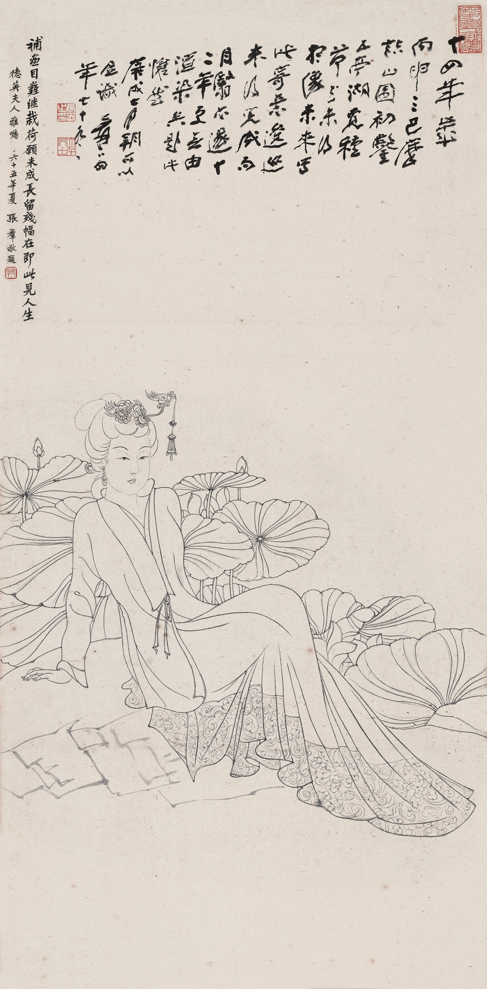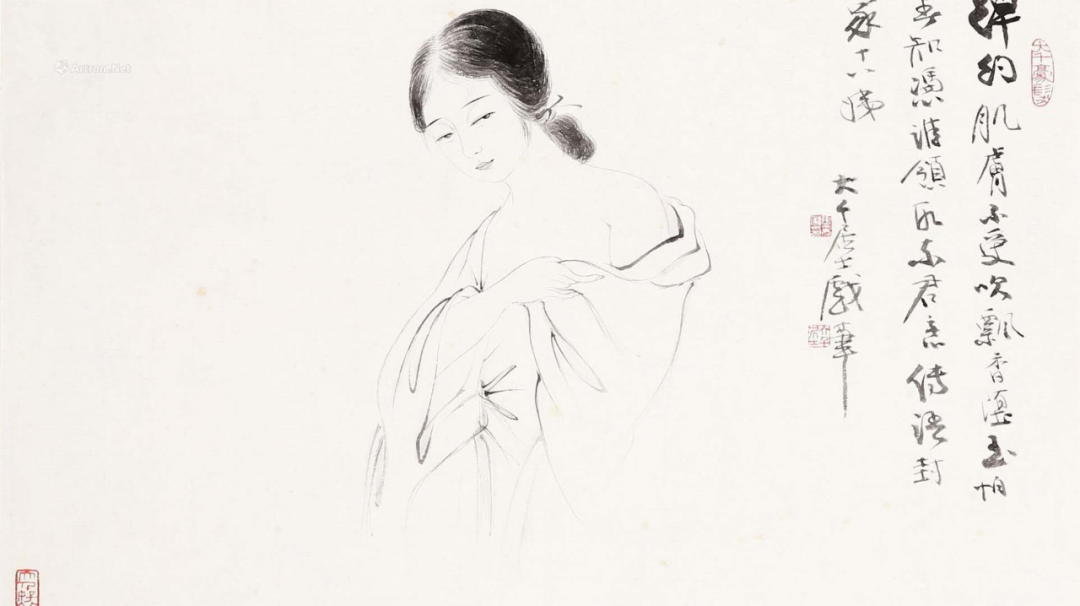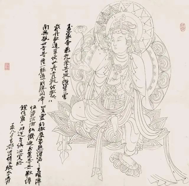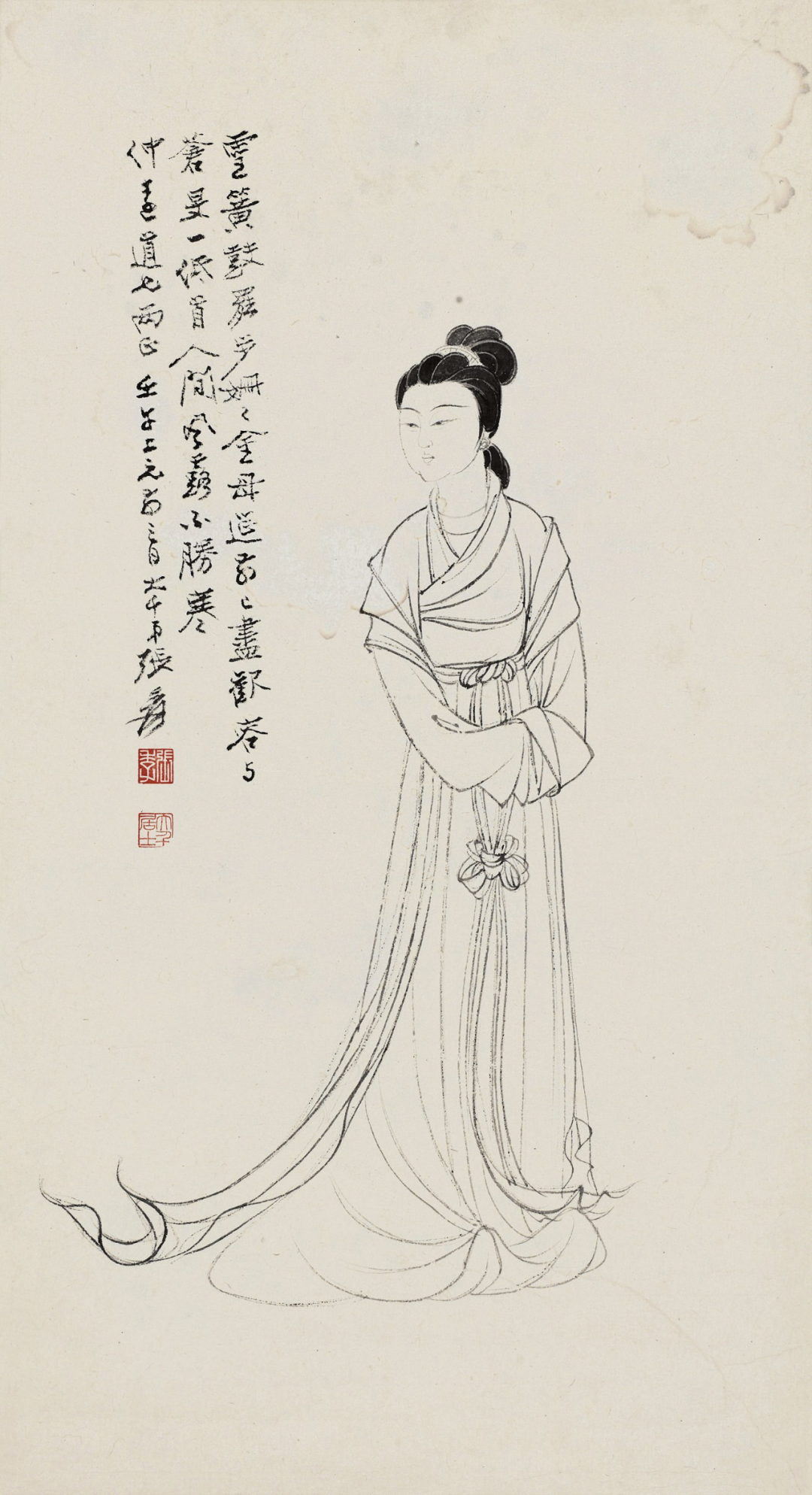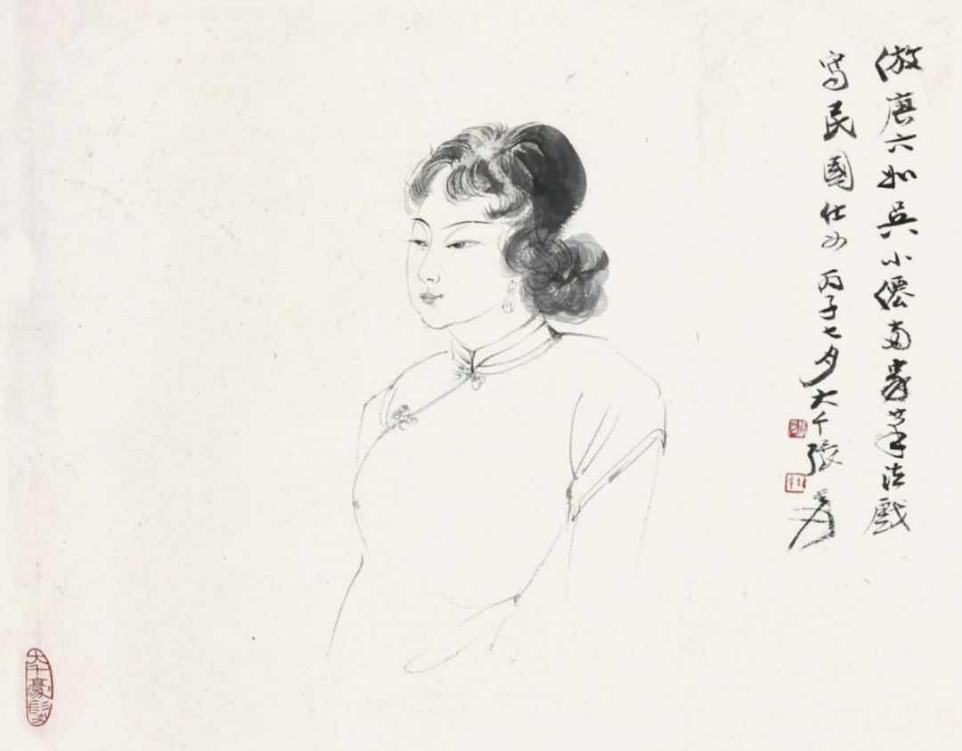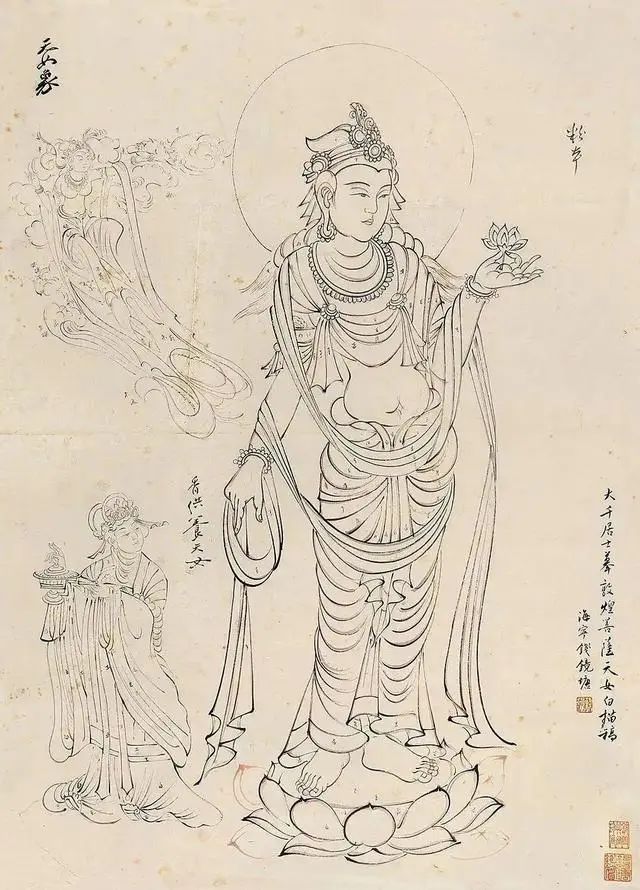 在线条运用上,张大千借鉴了敦煌壁画中线条的流畅与变化。他通过勾勒、敷设等技法,将线条运用得恰到好处,既表现了人物的形态美,又传达了人物的神韵和情感。