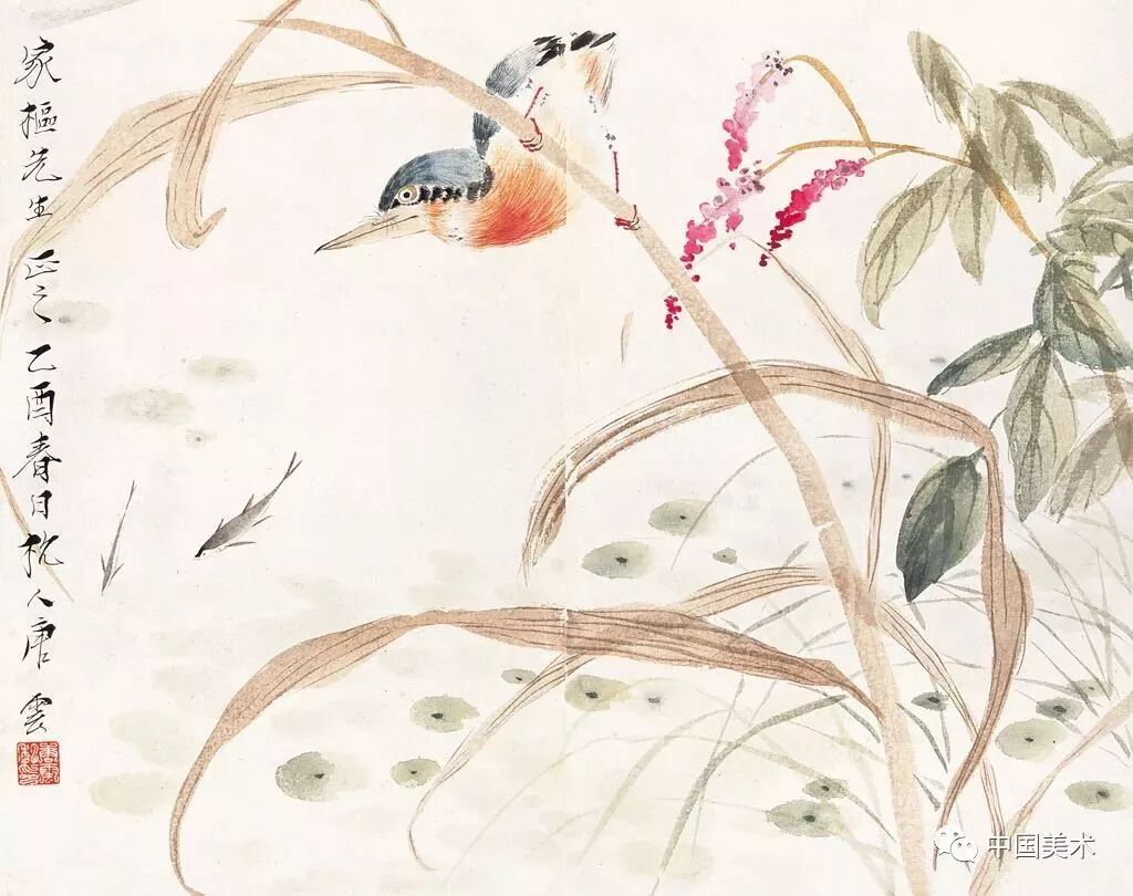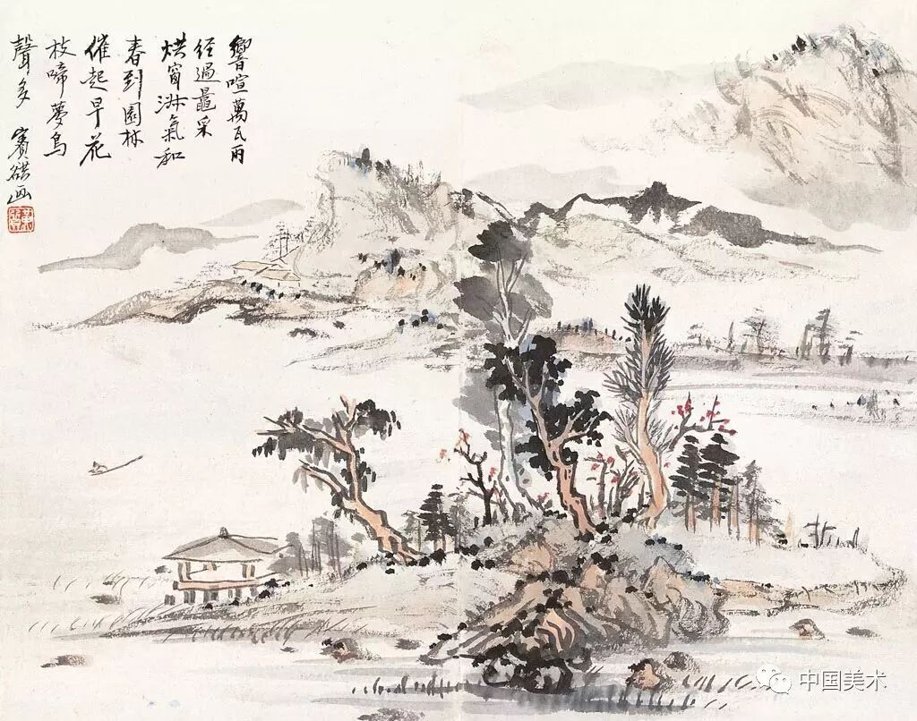 黄宾虹的一开山水,完全是“白宾虹”面貌,疏疏勾染,辅以题诗中“春到园林催起早,花枝啼梦鸟声多”,饶有逸气。