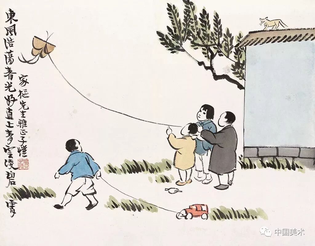 创造“漫话”一词的丰子恺,亦以漫画笔致入书画,“东风浩荡春光好,直上青云凌碧霄”—放风筝的儿童、拉着玩具车回头羡慕地看着别人放风筝的儿童、墙瓦上的小猫,皆寥寥几笔,而意趣毕现。