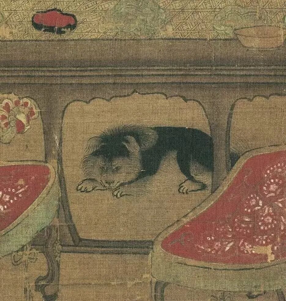 桌底趴着一只小黑犬,在庄重的宫廷场景里格外显眼,这不仅是生活情趣的体现,更暗示了唐代贵族对宠物的宠爱,是 “古代铲屎官” 的铁证。